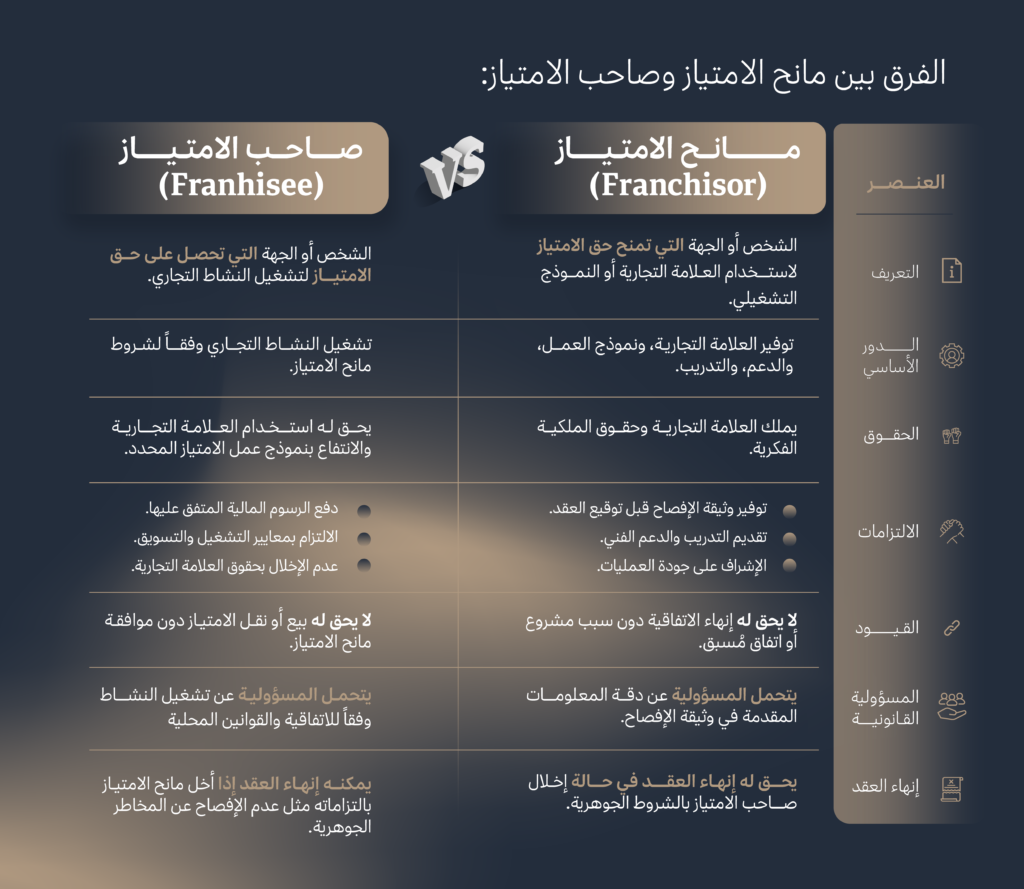 صاحب الامتياز: هو الشخص أو الشركة التي تحصل على الامتياز، وتلتزم بتشغيل النشاط وفقاً لشروط مانح الامتياز.