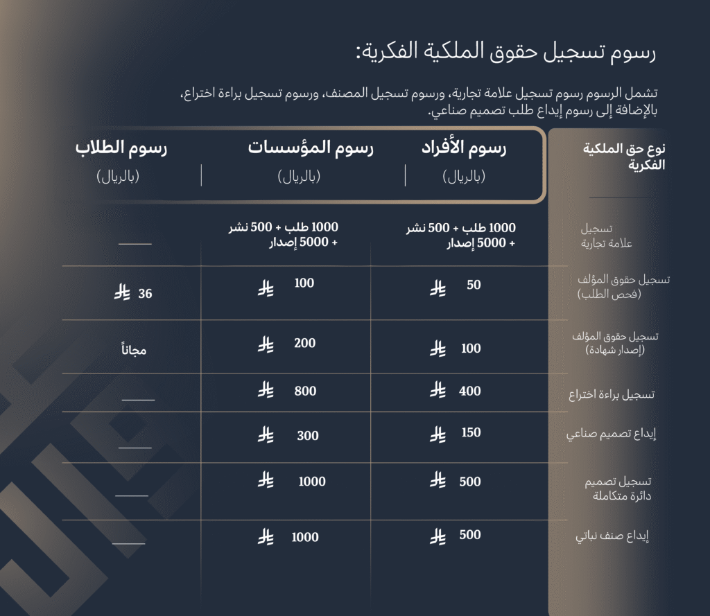يقدم الجدول التالي مقارنة واضحة لرسوم تسجيل حقوق الملكية الفكرية وفق أنظمة الهيئة السعودية للملكية الفكرية، مع توضيح الفروقات بين الرسوم المفروضة على الأفراد، والمؤسسات، والطلاب لكل نوع من حقوق الملكية الفكرية.