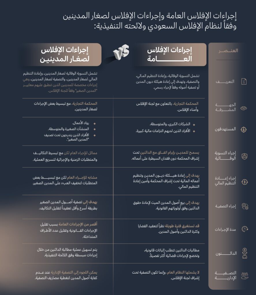 مقارنة تفصيلية بين إجراءات الافلاس العامة وإجراءات الافلاس لصغار المدينين وفقاً لنظام الافلاس السعودي ولائحته التنفيذية